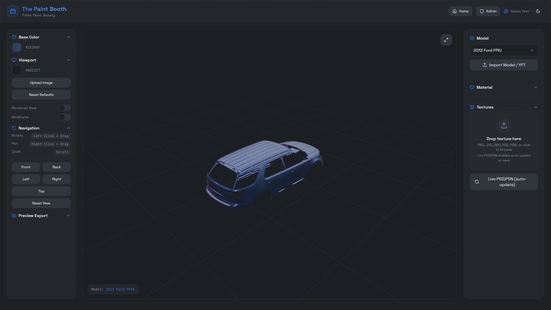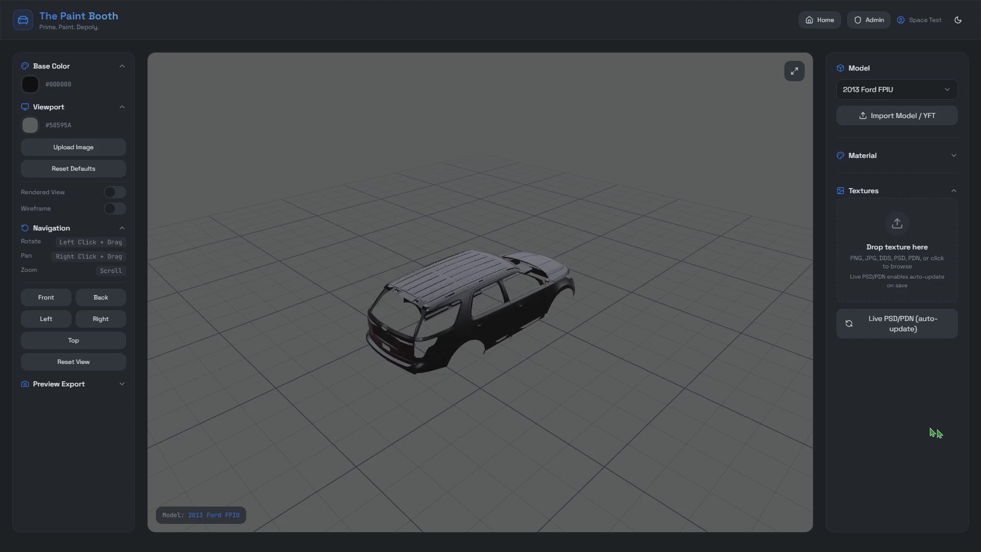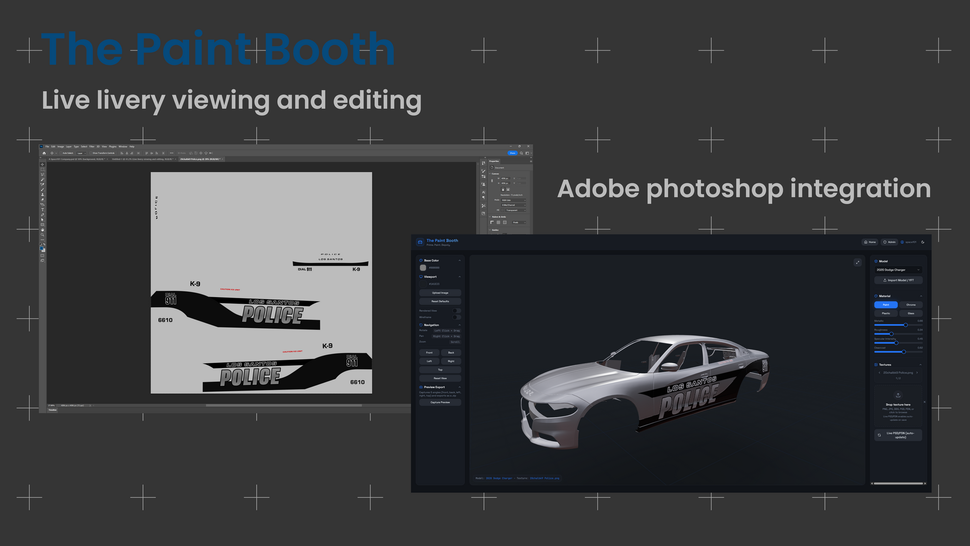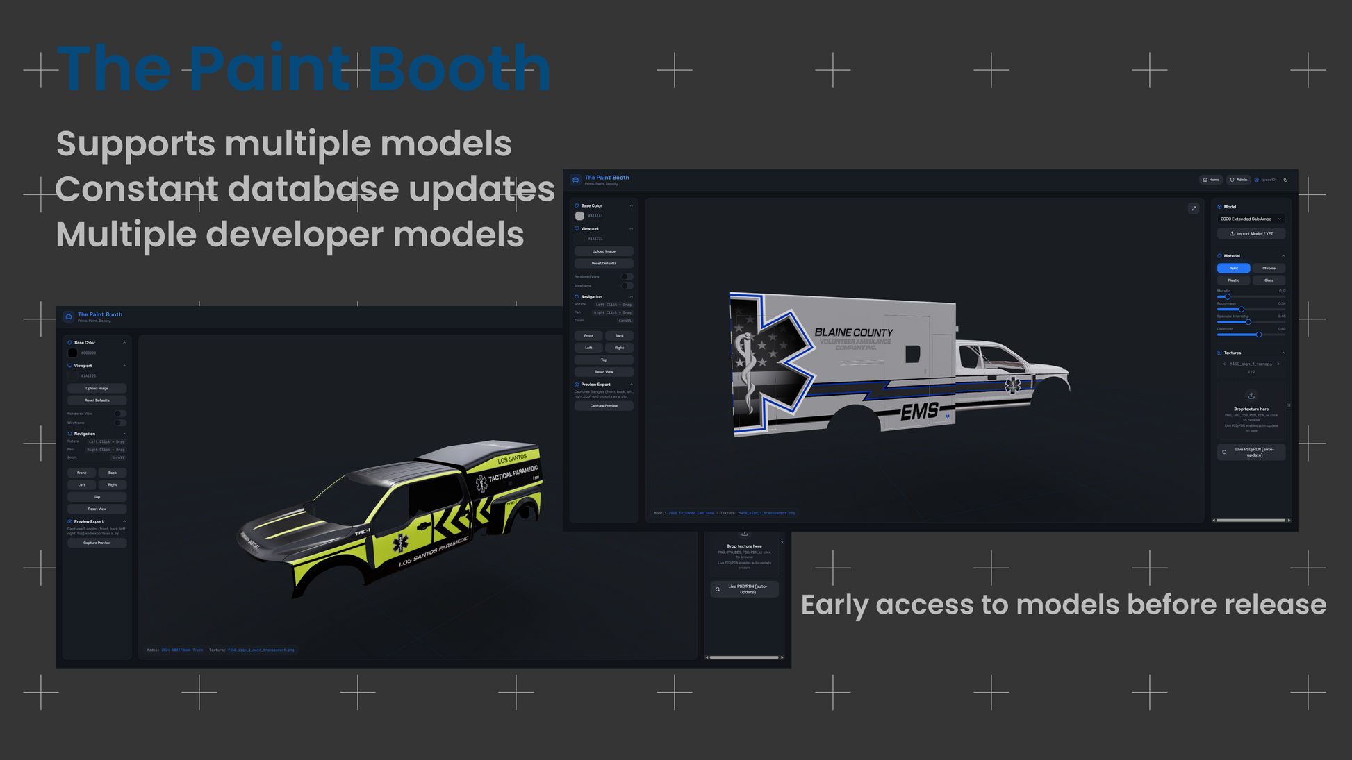 Paint Booth, enables real-time vehicle livery visualization and editing right on the model without needing to test in game. With PSD/PDN integration and endless viewing and customization settings. Ability to test a texture to see what vehicle it fits!